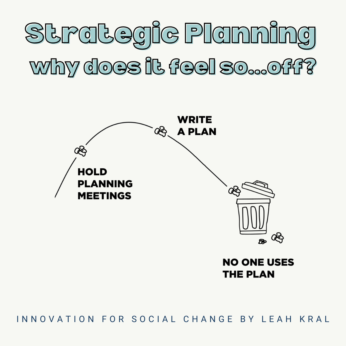 Traditional strategic planning seems like something we should do. Like eating broccoli, we assume it is good advice, even if we don’t love it. It’s in every nonprofit management textbook. Grant makers seem to expect it. Boards assume it’s best practice. So we’ve never really questioned it. We just did it. And we assumed the quiet unease we felt was our problem, not the process’s.